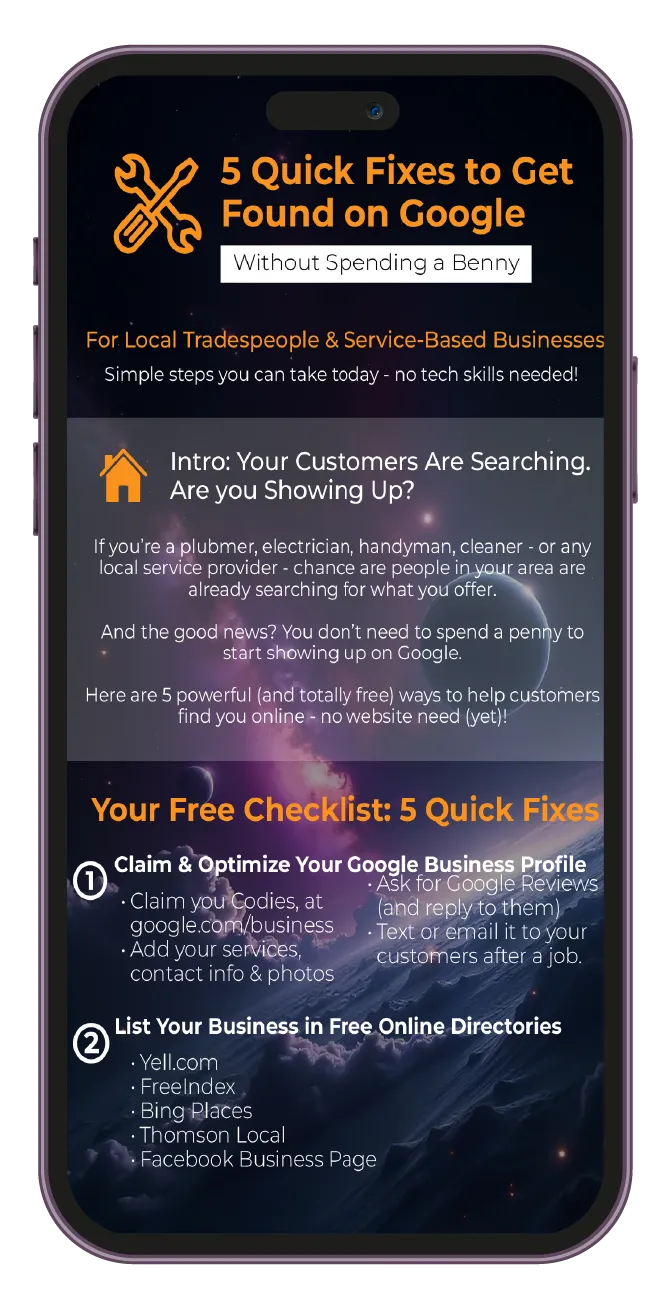 Grab our free guide, "5 Quick Fixes to Get Found on Google," and discover simple steps you can take today to boost your visibility. Perfect for busy business owners — no tech skills needed!